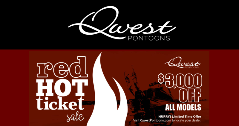 Get ready to save big with the Red Hot Ticket Sale! This is your ticket to incredible savings—$3,000 off any new in-stock Qwest Pontoon model.